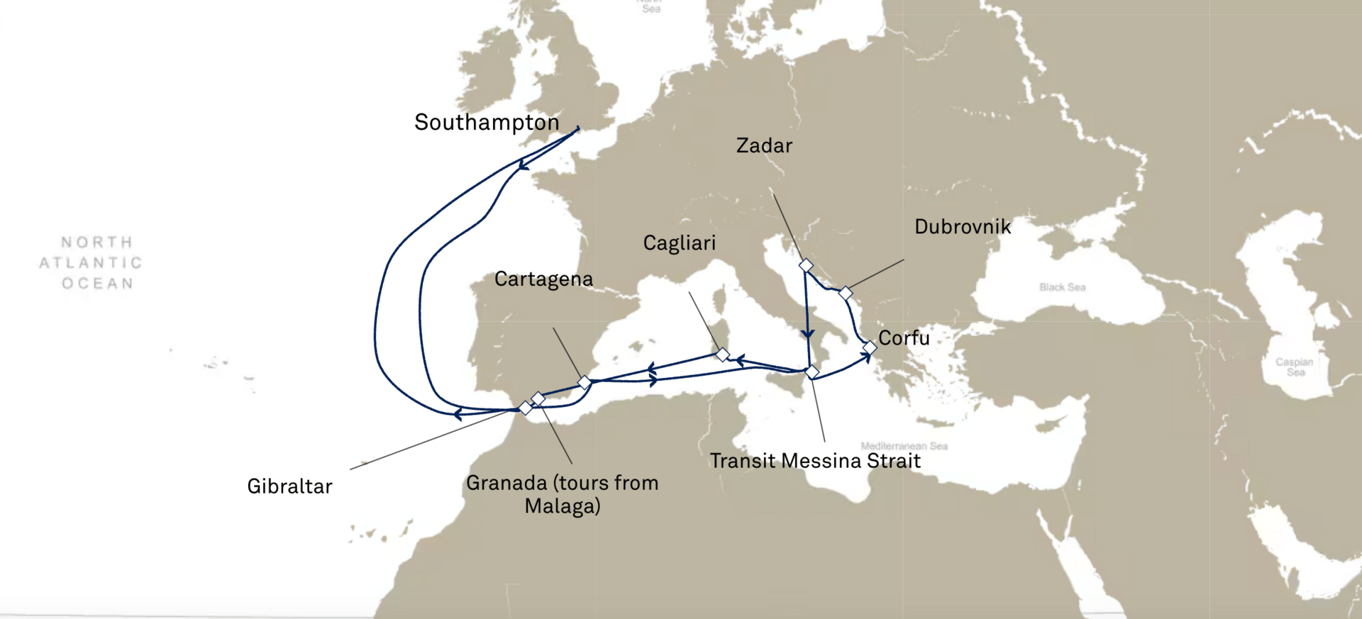 You’ll visit Spain’s sun-soaked ports, the storybook coasts of Croatia, and the timeless isles of Greece—all before circling back through the Strait of Messina and across the Iberian Peninsula.